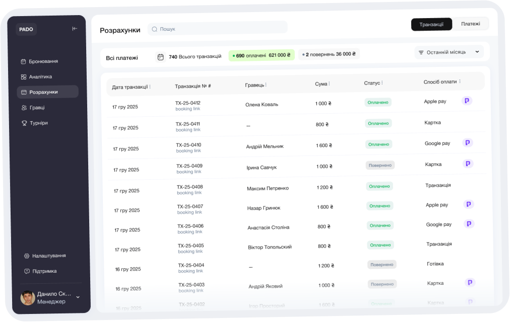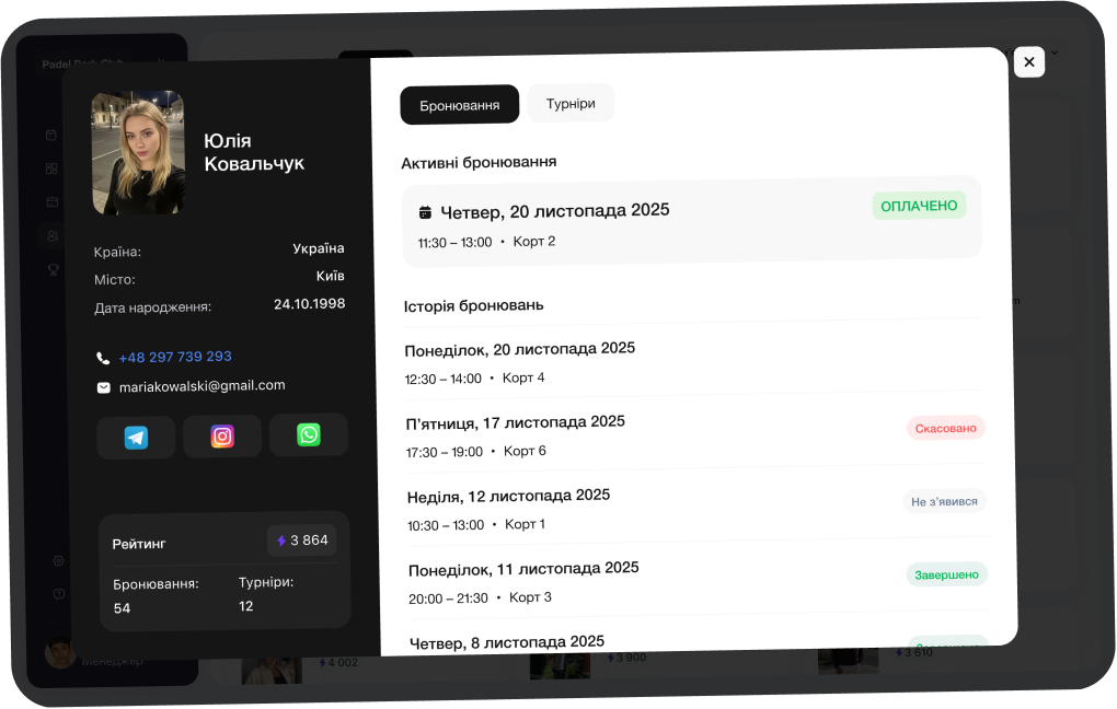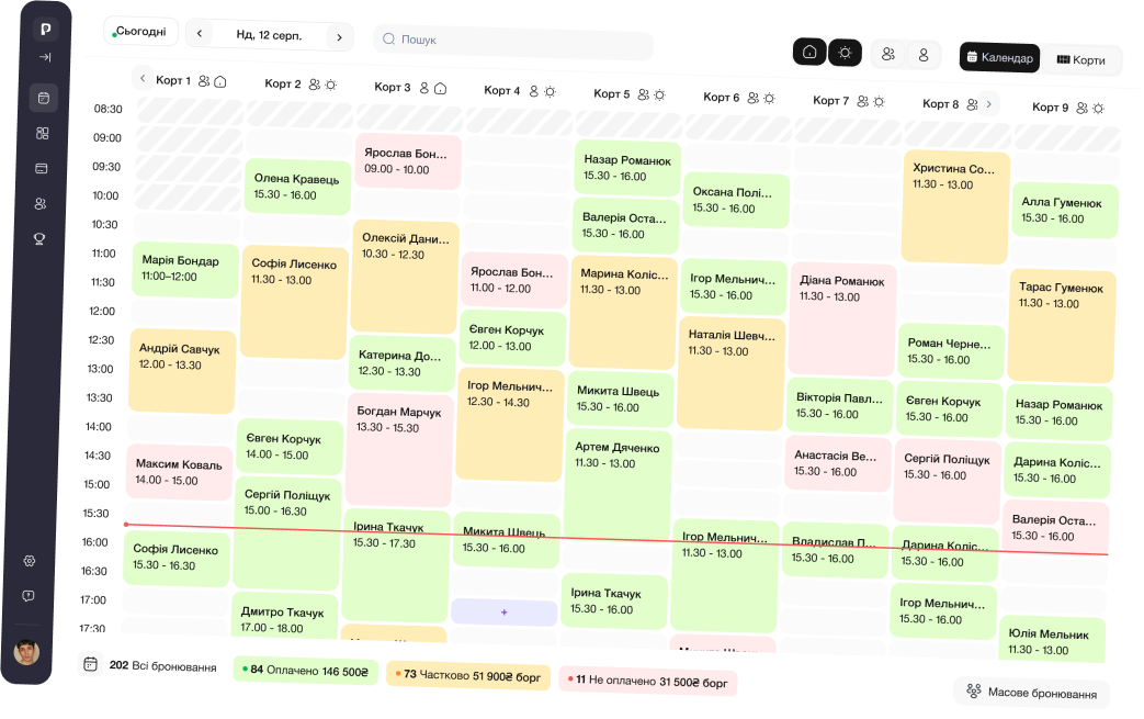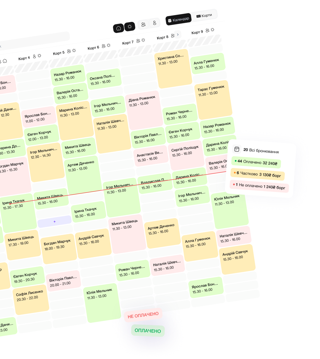 Manage schedule, check court availability, payment statuses and match details without extra clicks, chats and manual work.