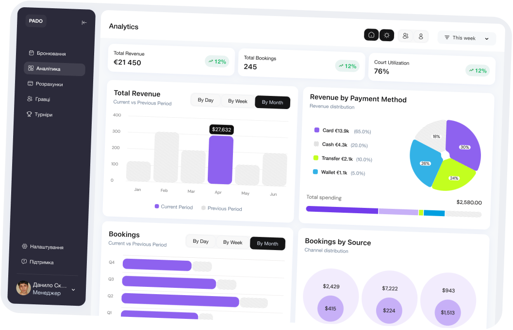 Analyze peak hours, court occupancy and financial indicators to optimize schedule and prices.
