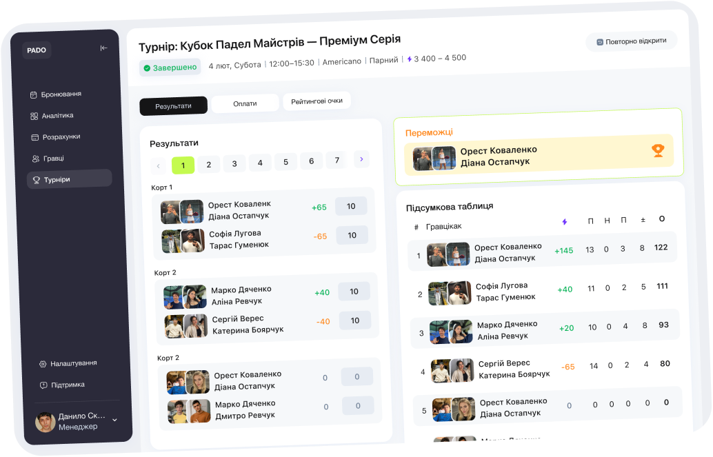 PADO automates match formats, player rotations, results and scoring — all in real time.