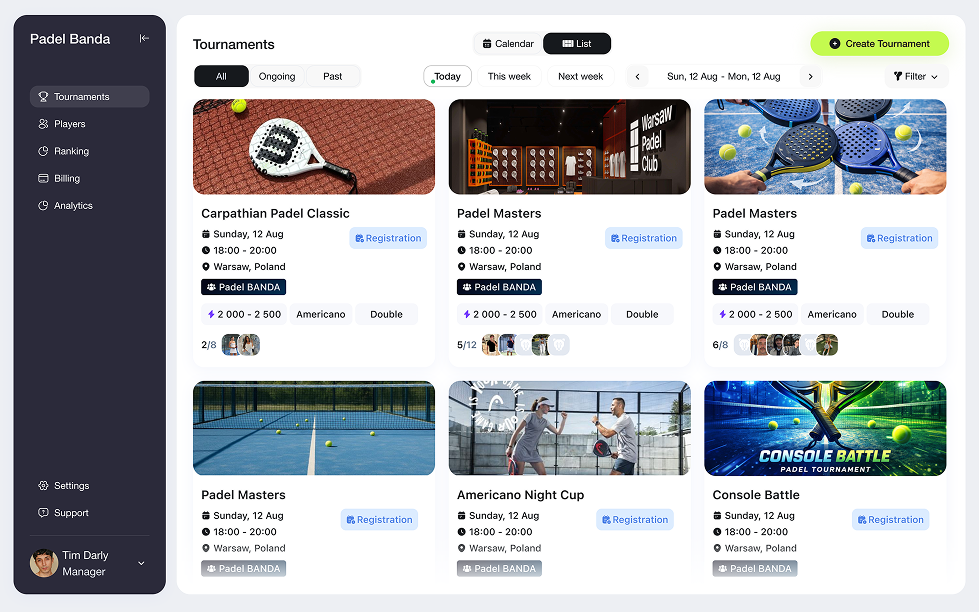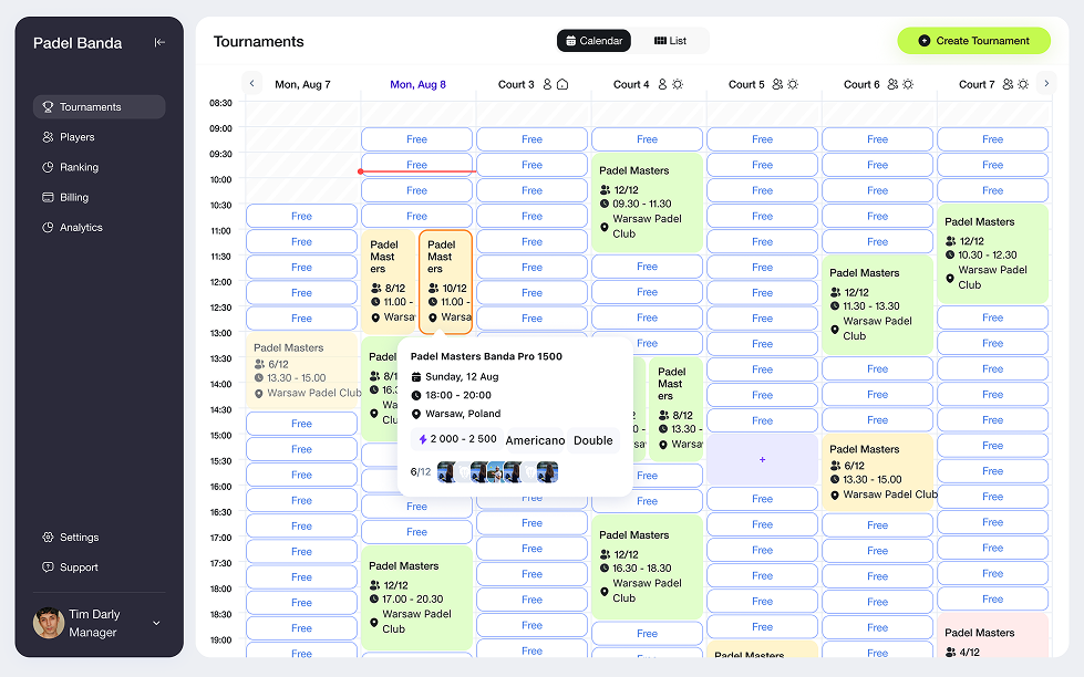 Z PADO możesz w pełni zarządzać klubem w jednym miejscu — kontrolować harmonogram kortów, obłożenie, organizować turnieje i śledzić kluczowe metryki. Platforma eliminuje chaos rezerwacji przez komunikatory i zastępuje go uporządkowanym systemem.